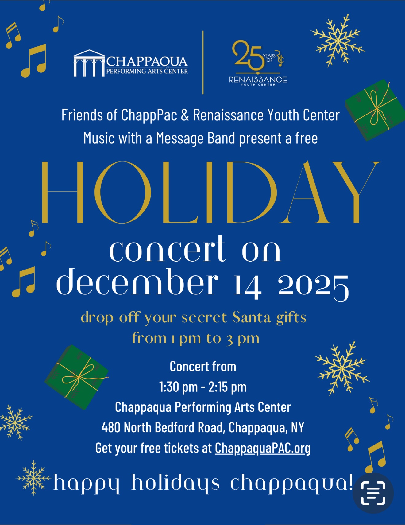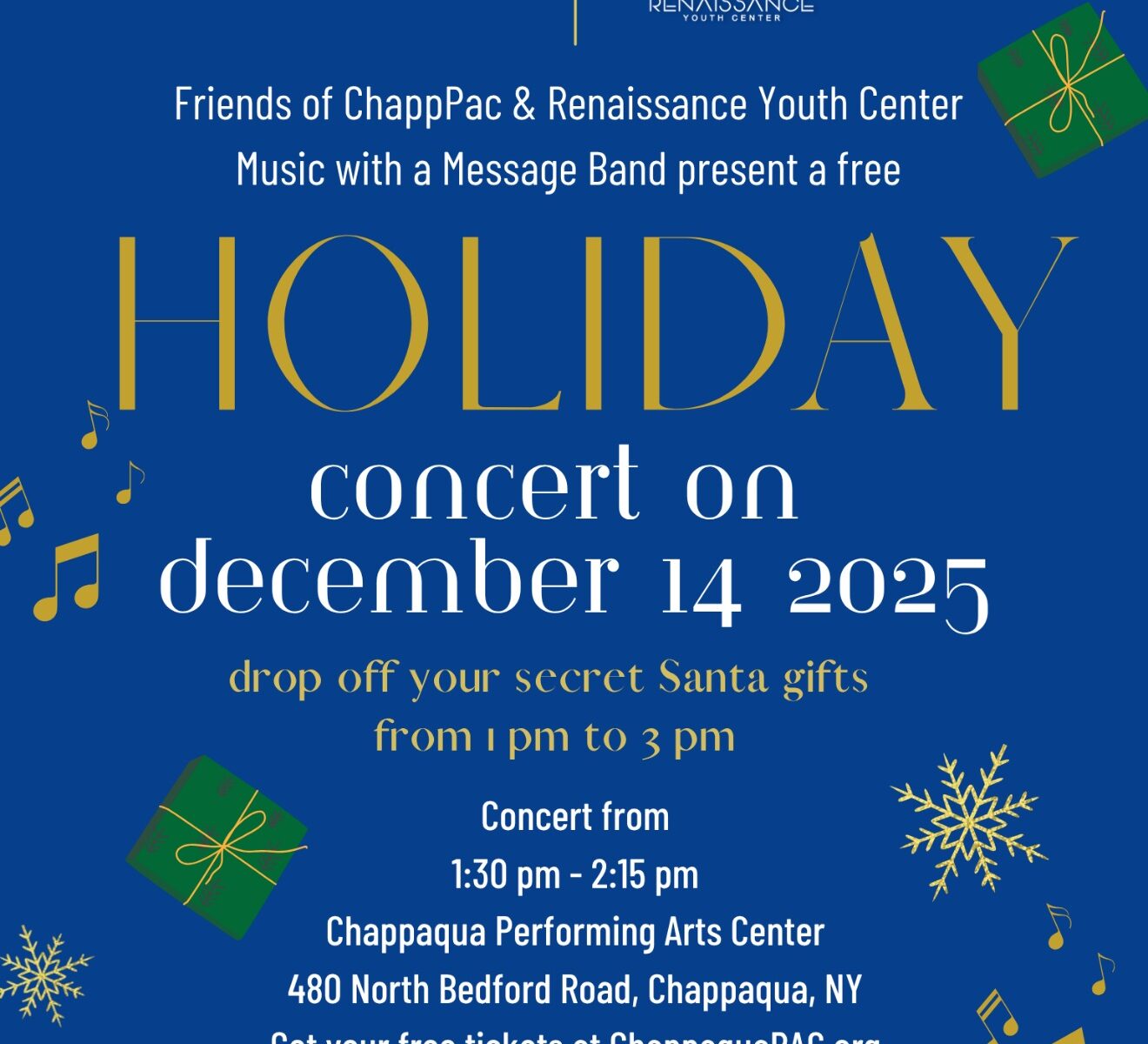 Join the Friends of the ChapppPAC for a FREE holiday concert featuring the incredible Renaissance Youth Center’s Music With A Message Band—a group that has performed on Good Morning America, at Carnegie Hall, Lincoln Center, Yankee Stadium, and the Apollo Theater.