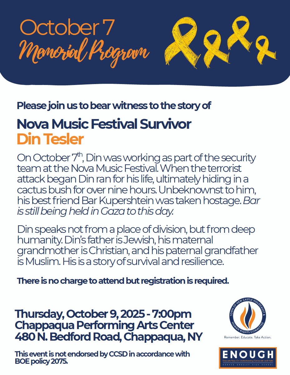 Please join the New Castle Holocaust & Human Rights Committee and HGHS ENOUGH Club to bear witness to the story of Nova Music Festival Survivor Din Tesler.
